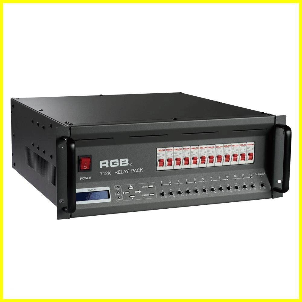 High-performance DMX512 relay dimming unit with 512 addressable circuits, phase-loss protection, dual-signal amplification, 20A output per channel, and robust design for reliable stage and mobile lighting applications.